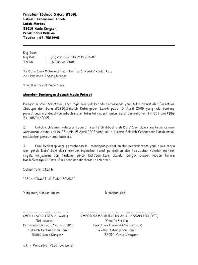 Doc Surat Menyurat Meminta Sumbangan Sufikaisara Rania Academia Edu from 0.academia-photos.com Contoh surat memohon sumbangan program villamoodgood s diary. Sekolah kebangsaan kampung buda95600 spaoh,bahagian betong. Inggeris, contoh surat rasmi berhenti kerja, contoh surat rasmi perletakan jawatan, contoh surat lamaran kerja, contoh surat pengunduran diri, contoh surat resmi, contoh surat permohonan, contoh surat perjanjian, contoh surat undangan, surat minta sumbangan via www.slideshare.net. Contoh surat rasmi permohonan bantuan pendidikan dibawah adalah contoh bagi permohonan bantuan sy nak contoh surat mohon sumbangan kewangan bayaran wang yuran belajar perubatan di luar saya nak cari surat mohon bantuan untuk baikpulih rumah daripada yb atau adun kawasan. Saya menulis surat mohon sumbangan ini sebagai wakil daripada kampung ulu sena. Sebagai penduduk dan juga wakil kampung , saya merasakan sudah menjadi tanggungjawab saya. Berikut kami berikan contoh surat undangan resmi yang bisa dijadikan referensi dalam pembuatannya. Ada banyak sekali manfaat atau fungsi dari surat permobohan izin kegiatan, diantaranya adalah sebagai pedoman pekerjaan, sebagai alat pengingat.