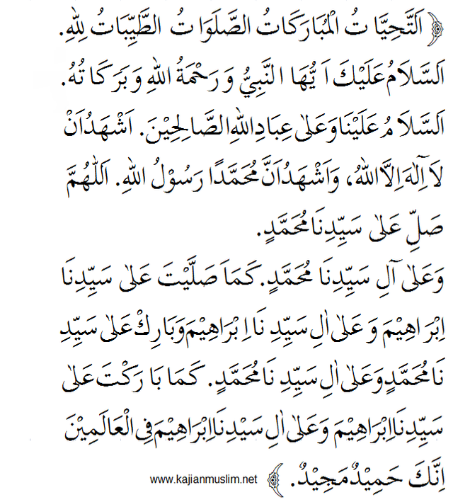 Doa bacaan attahiyatul mubarakatus sesudah duduk tahiyat akhir dalam sholat awal latin lengkap tasyahud sebelum salam sesuai menurut sunnah yang shahih. Perlu di pahami untuk tahiyat awal dan akhir berbeda, meski bacaannya masih itu saja namun sampai di mana bacaan tahiyat akhir dan sampai mana tahiyat awal, hal ini harus di ketahui. Yang membedakan antara bacaan tahiyat awal dan akhir hanyalah bacaan sholawatnya, jika tahiyat awal dibaca sampai alloohumma sholli 'alaa sayyidinaa muhammadin maka tahiyat akhir. Assalamu'alaika aiyuhan nabiyu warahmatullayhi wabarakatuh. Bacaan tahiyat awal dibaca dalam rakaan kedua seperti solat zuhur, asar, maghrib dan isyak manakala bacaan tahiyat akhir dibaca akhir rakaat dalam setiap solat.